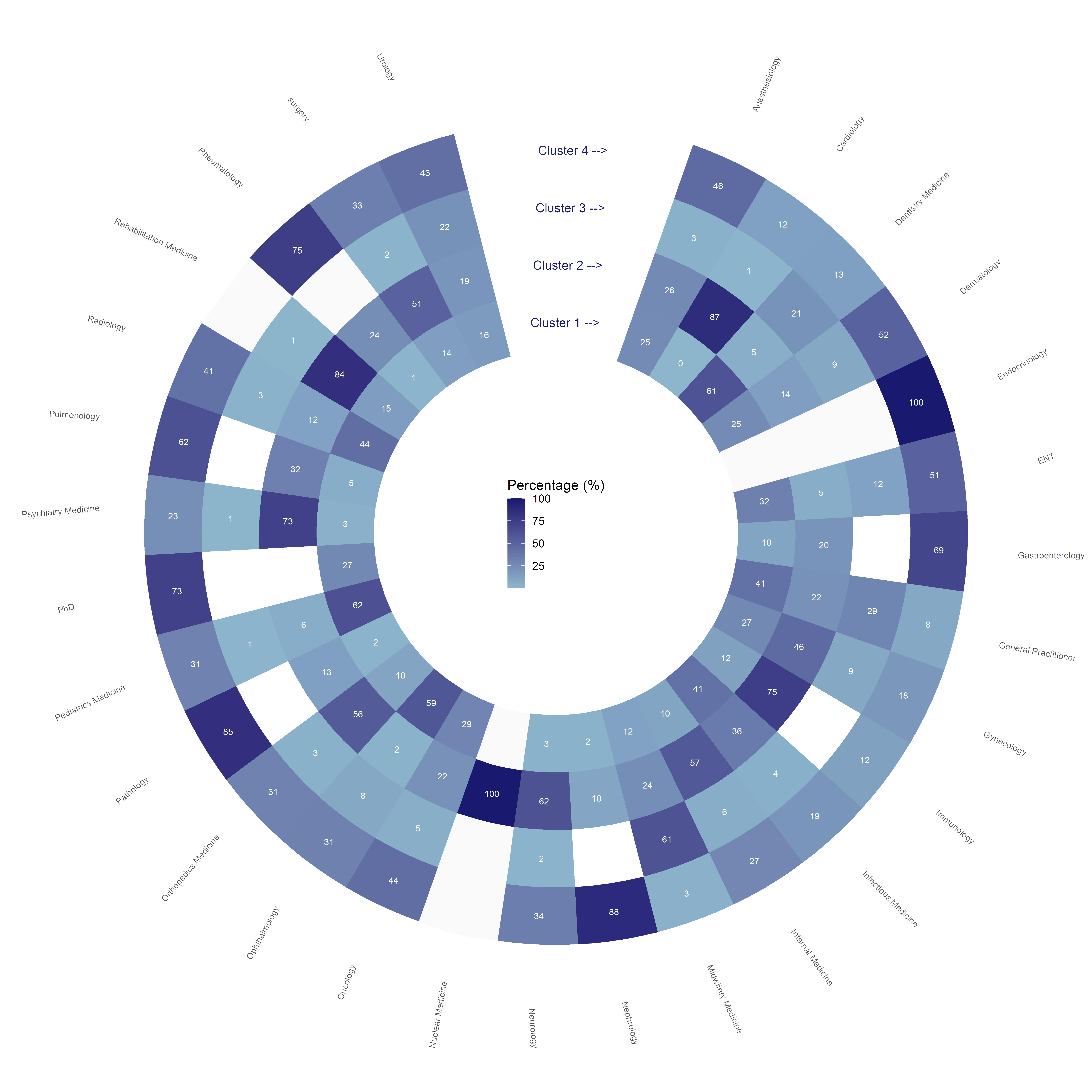 Figure 1: The heatmap plot of the specialty variable in four clusters.